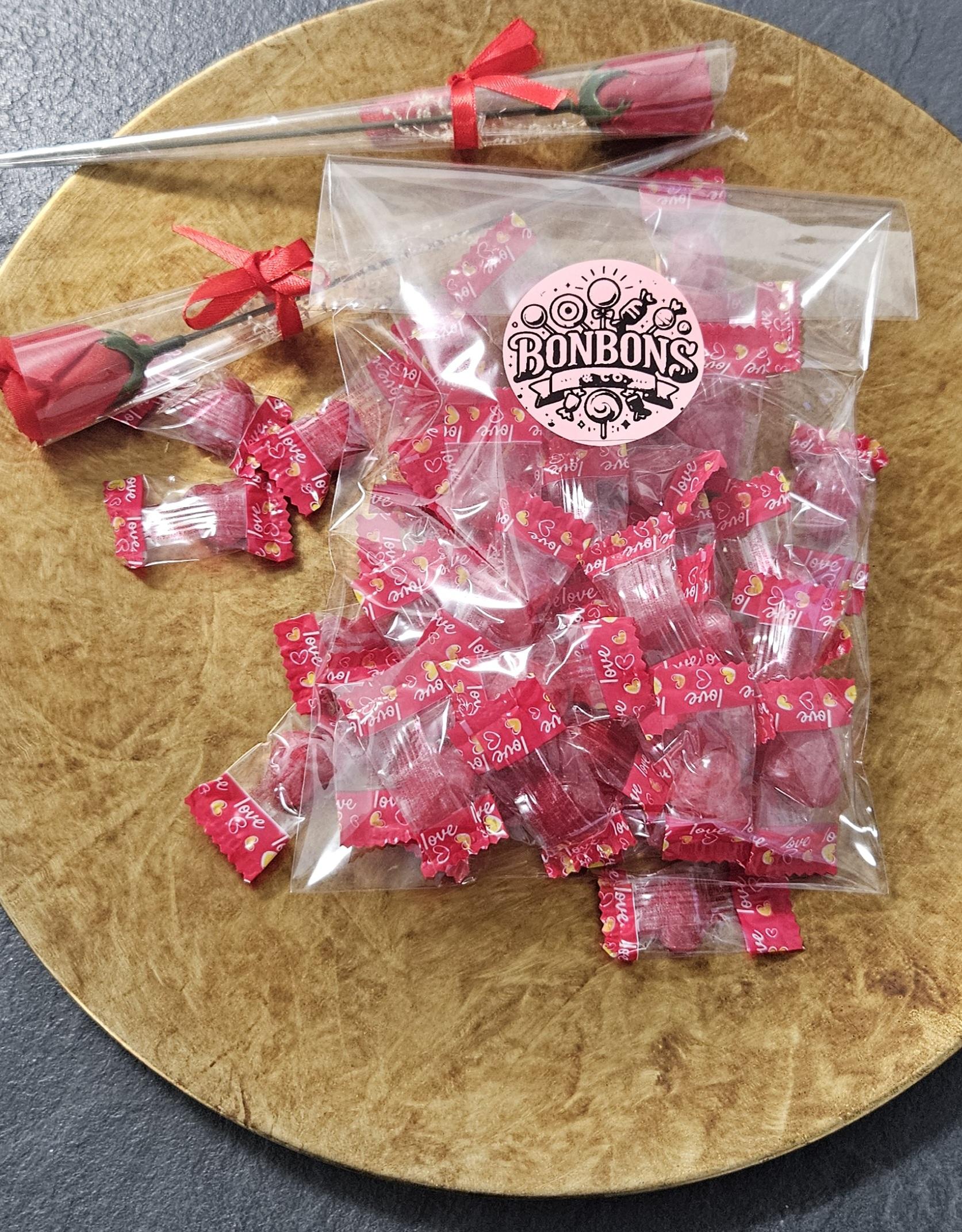 Petits bonbons durs en forme de cœur emballés individuellement (goût cerise)
