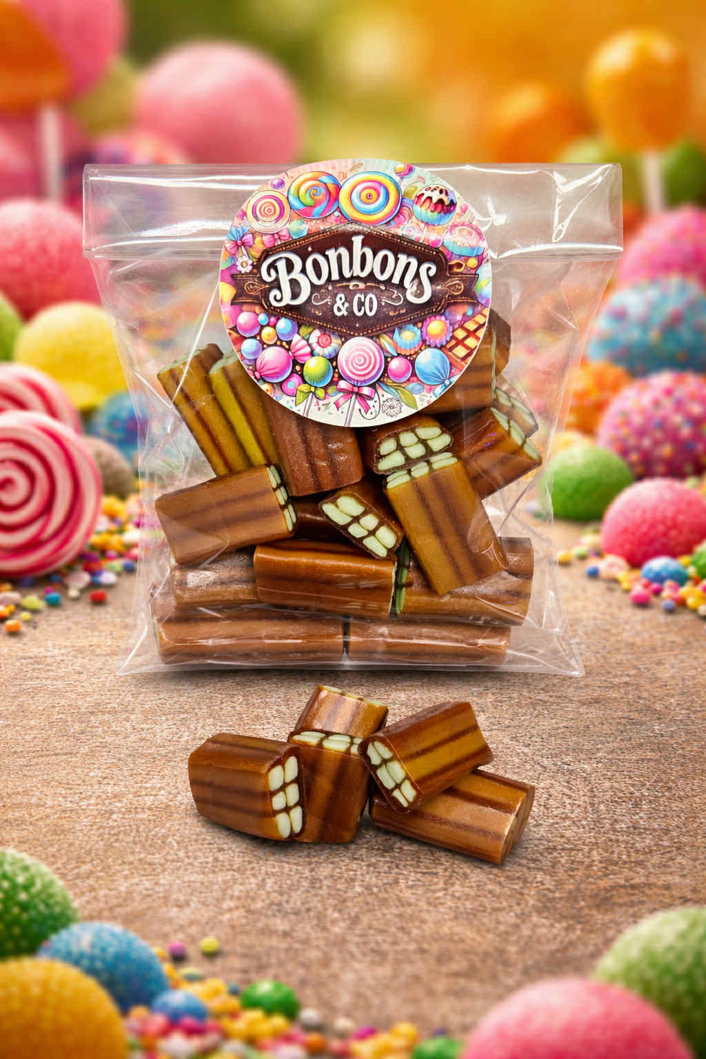 Ingrédients : Sucre, sirop de glucose-fructose, amidon, farine de blé, sirop de sucre inverti, eau, acidifiant (E330), amidon de pomme de terre, maltodextrine, humectant (E422), graisse végétale (palme), correcteur d'acidité (E332), gélatine de bœuf halal, arôme artificiel, agents d'enrobage (huile végétale (palme)), émulsifiant (E322), colorants (E100, E133, E150c)