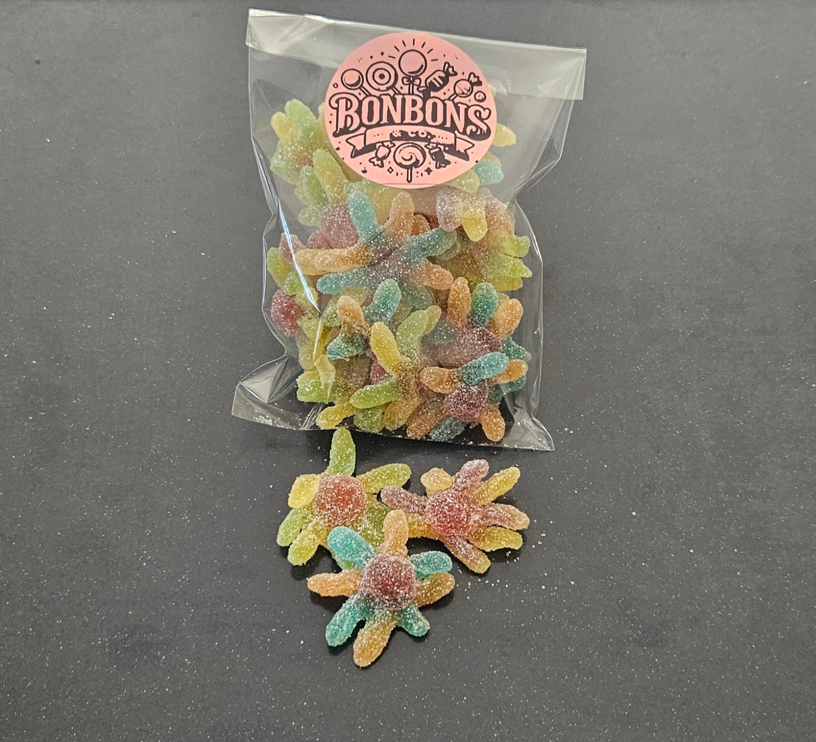 - Ingrédients : (sous réserves de modification par le fabricant) Sirop de glucose, eau, sucre, amidon, gélatine de bœuf, acidifiants : acide citrique, acide malique, arômes, régulateur d'acidité : citrate de sodium, colorants : E100, E120, E133.