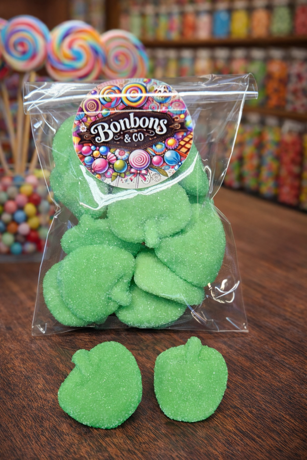 Ingrédients: Sirop de glucose, sucre, eau, gélatine de bœuf halal, amidon modifié de pomme de terre, acidifiants (E270, E330), pectine, arôme artificiel, colorants (E100, E133).