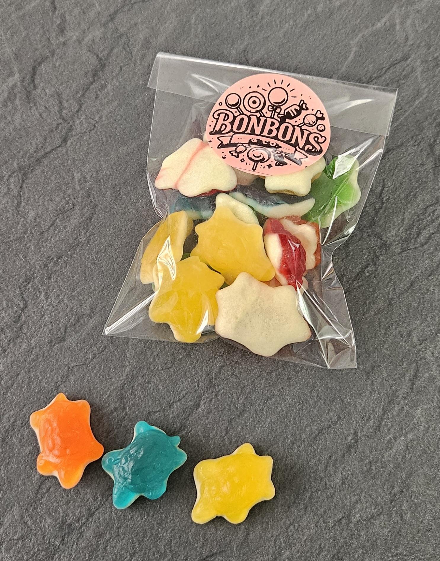 - Ingrédients : (sous réserve de modification par le fabricant) Sirop de glucose, sucre, eau, gélatine de bœuf, humectant E420(ii), amidon modifié de pomme de terre, acidifiants : E270, E330, agent d'enrobage : huile végétale (palme) E901, E903, arômes, colorants : E100, E129, E133. Sans gluten.