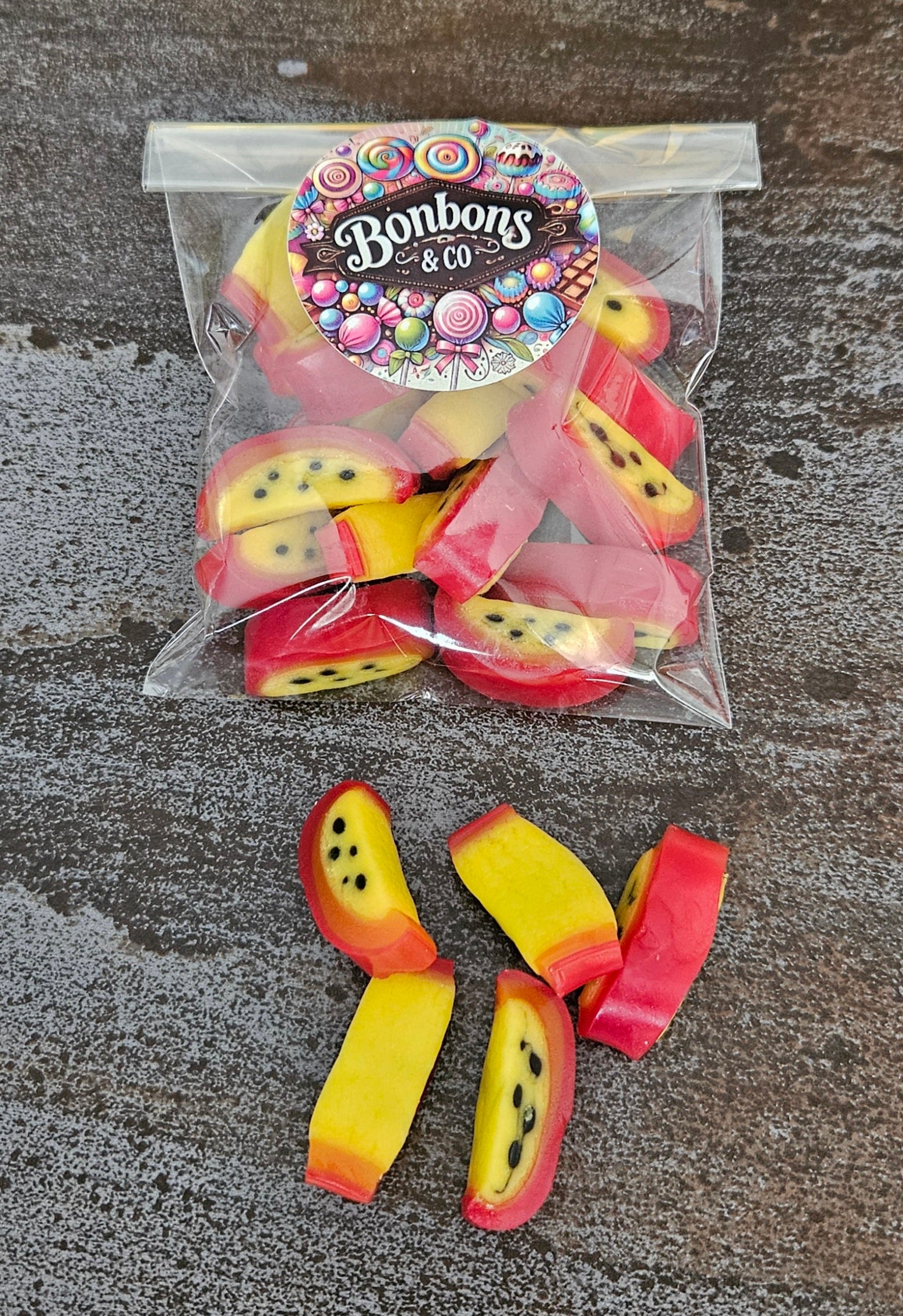 - Ingrédients : (sous réserve de modifications par le fabricant) Sucre, sirop de glucose-fructose, farine de blé (contient gluten), 10% jus de pomme à base de concentré, amidon de maïs, humectant: glycérol; graisse végétale de coco, sirop de sucre inverti; acidifiant: acide citrique; fécule de pomme de terre, arômes; correcteur d'acidité: citrates de potassium; huiles végétales (coco, colza), sel, émulsifiant: E471, colorants: E100, E120, E153. Allergènes : contient du GLUTEN.